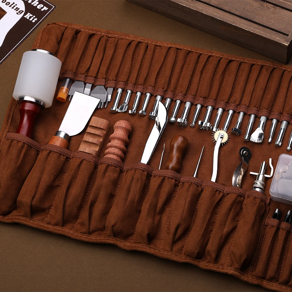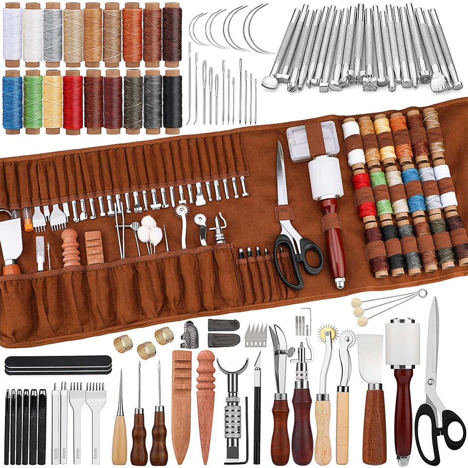 KRABALL Leather Working Kit Craft Tools Supplies With Sewing Thread Curved Needles Groover for Sewing Carving Punching Stamping