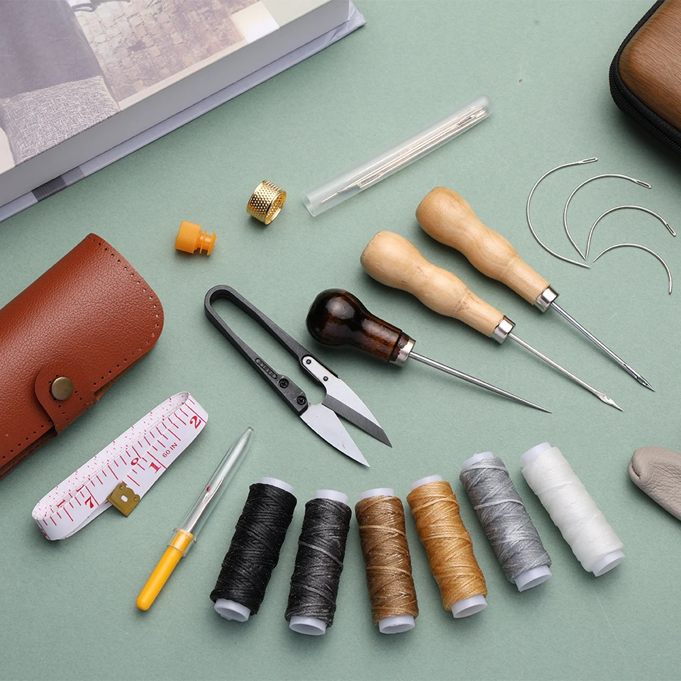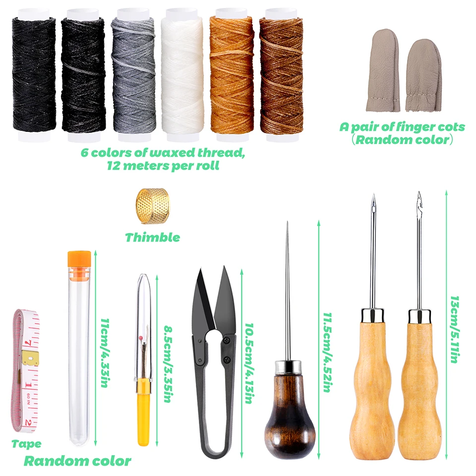 2) LEATHER SEWING KIT: The leather craft tool set contains 18-color wax thread (30m/33yds per roll), awls, hollow punches, adjustable groover, tracing wheels, thimbles, scissors and various types of leather sewing needles, etc. A variety of sewing tools are available to help you meet all your leather sewing project needs.