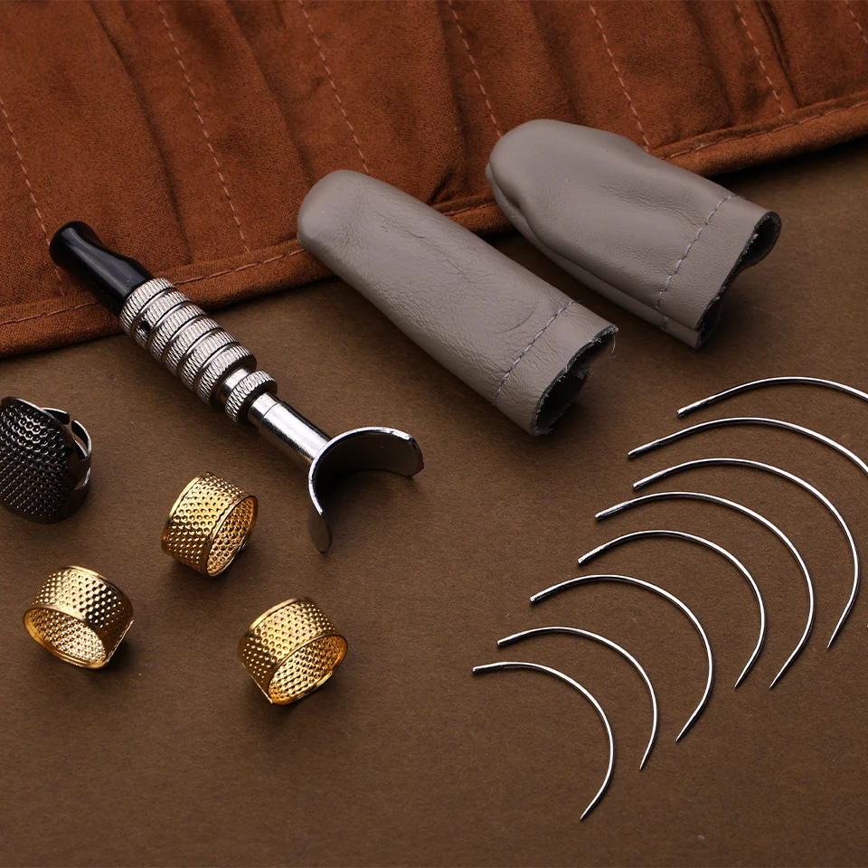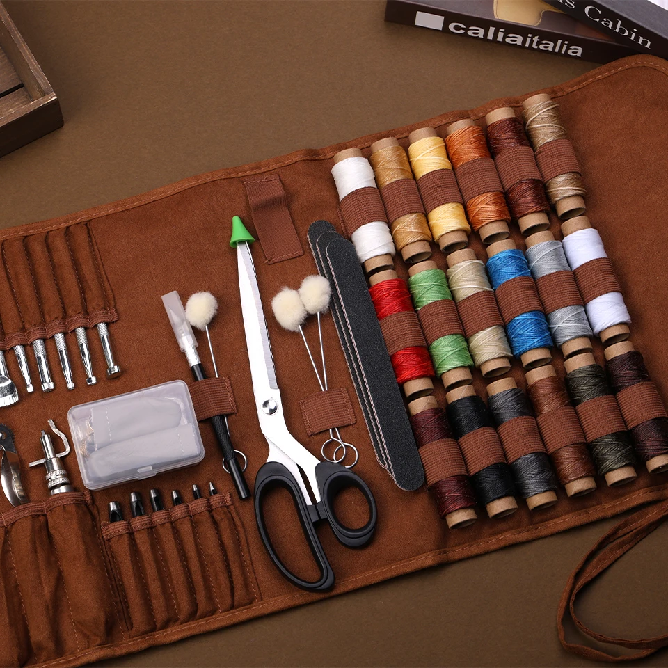 1)Set content: 6 pieces of 12-meter wax thread of different colors, 11 pieces of leather sewing needles, golden thimbles, black yarn scissors, tape measure, finger cots, storage bags, needle bottles, different types of awls, a total of 27 .